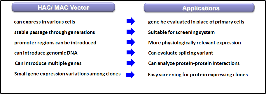 Our technical strength resides on ability to introduce large set of genes and their regulatory regions into practically any cells. Those genes are introduced to host in a form of artificial chromosomes, which enable us to develop stable cell lines compared with ones using plasmid. Transgenic animals can be created by applying HAC/ MAC (Human/Mouse Artificial Chromosome) vector to ES cells.